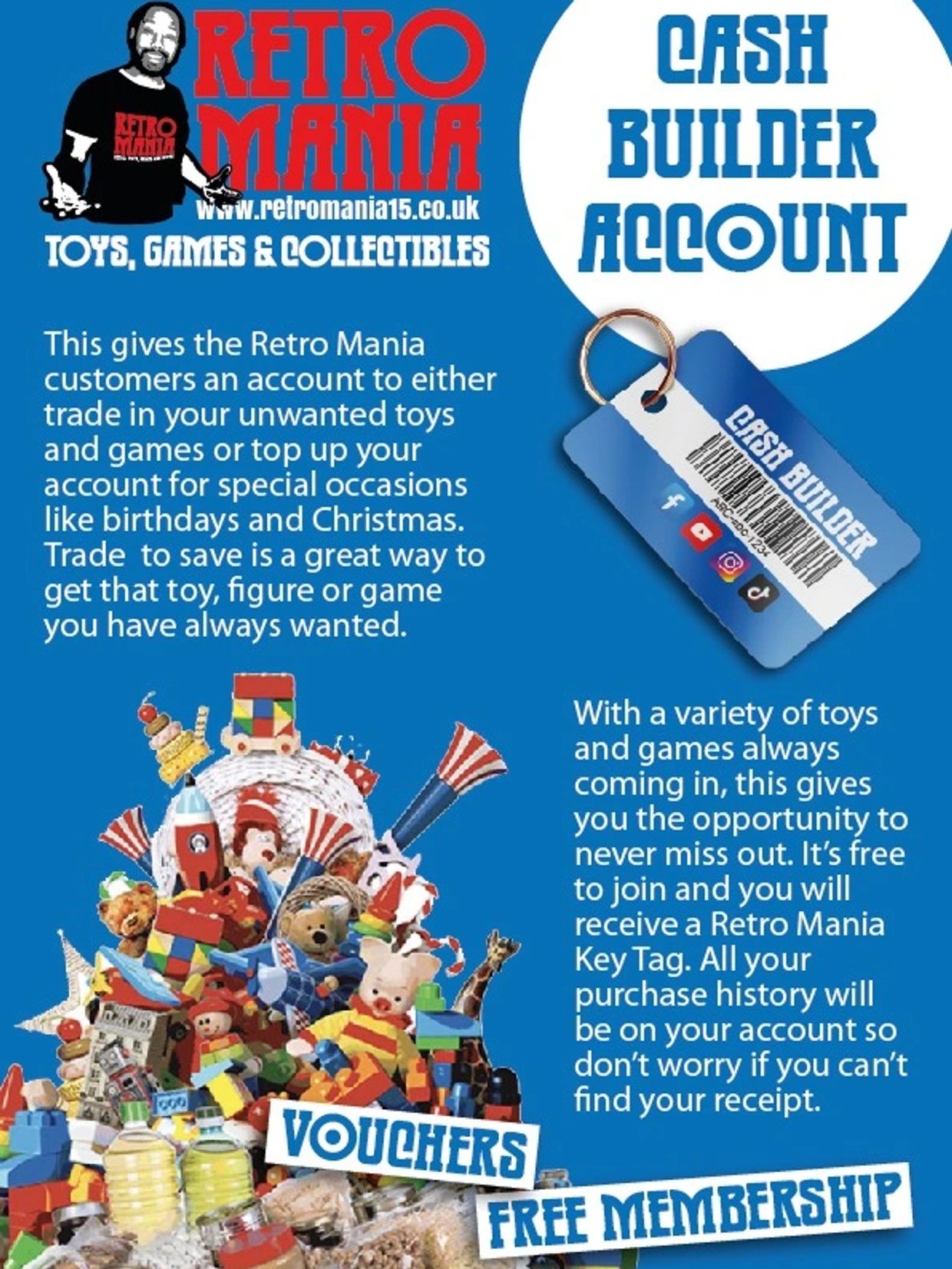 Here at Retro Mania we have designed a Cash builder, this gives our customers opportunity to use a saving account which can be used to top up small amounts each week ready to spend for Christmas or any special occasion, or trade in unwanted items with us we offer cash or amount credited to your cash builder account. Customers using it already to save have given great feedback. If you are interested in getting a membership it's free to join, only takes a few minutes. Vouchers are also available to purchase at the shop.